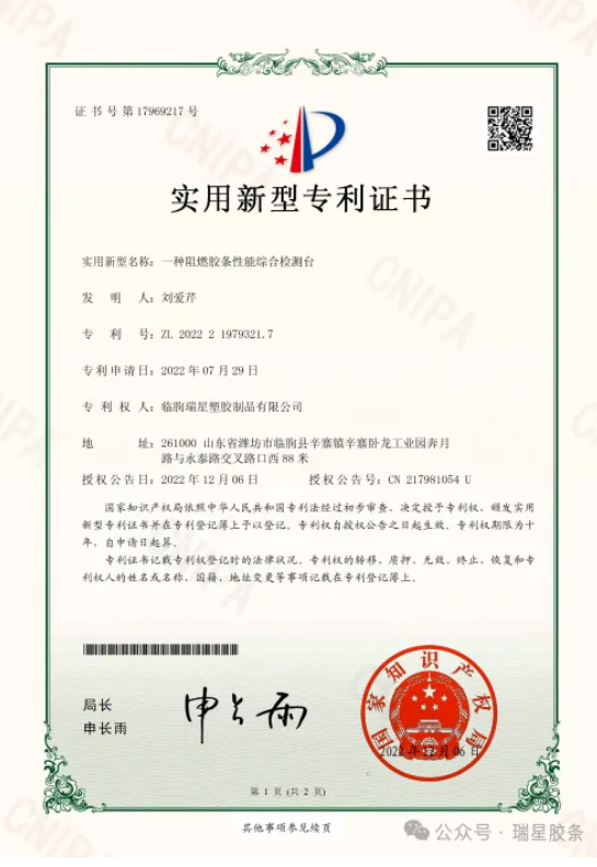 瑞星公司为保证产品的持续创新与发展,与山东科技大学深度合作,成立瑞星高分子聚合物研发中心,持续进行研发投入,成立专业的研发团队,积极与各大科研院所的专家学者合作,进行产品应用、人才培养、科技创新,保证企业在技术创新方面的独特的优势和能力,不断推出新型专利与优质产品。 一种阻燃胶条性能综合检测台