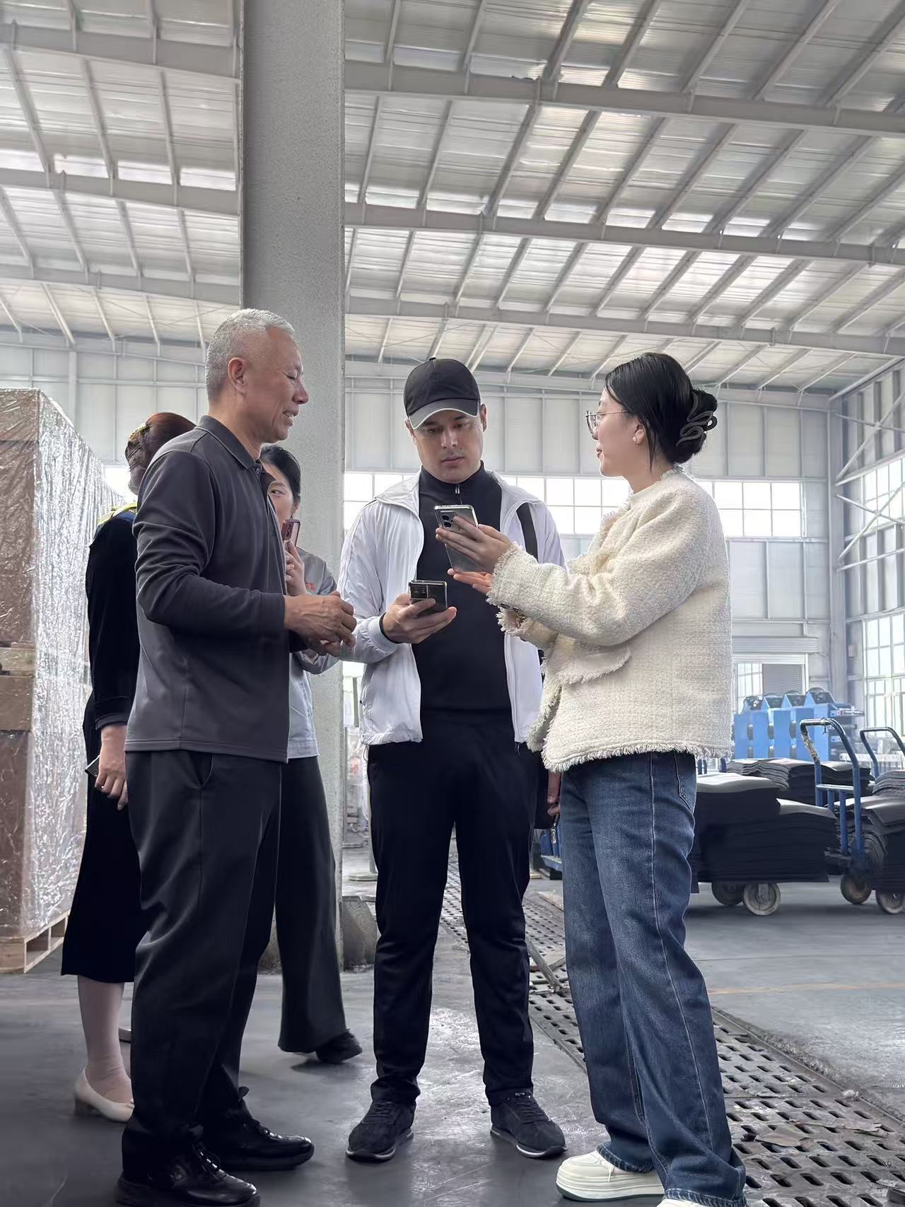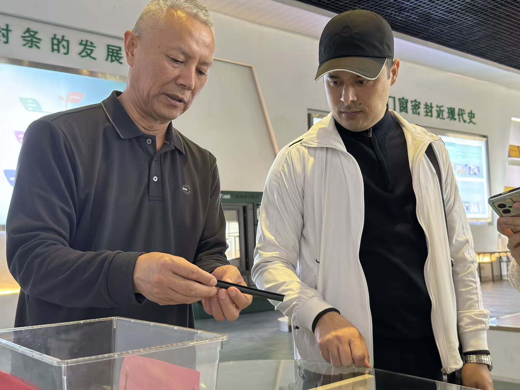 在窦总、刘总的陪同下,乌兹别克斯坦客户先后参观了公司生产车间与产品展馆。参观过程中,相关负责人详细介绍了公司的生产流程、核心技术、产品工艺以及质量管控体系,让客户全面了解瑞星在胶条/橡胶领域的研发实力与生产规模。在展馆内,客户近距离观摩了公司的明星产品、创新成果及行业解决方案,对瑞星的产品品质、技术创新能力给予了高度评价。